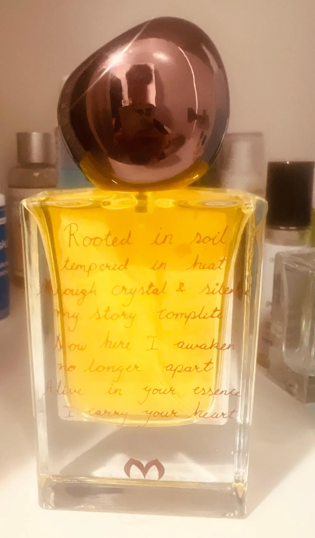 - 35 ml artisanal fragrance bottle with a handwritten poem etched on one side